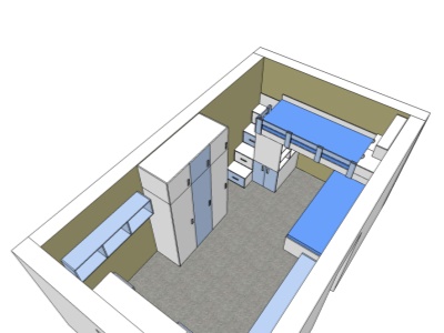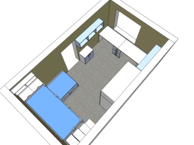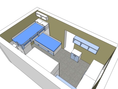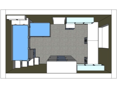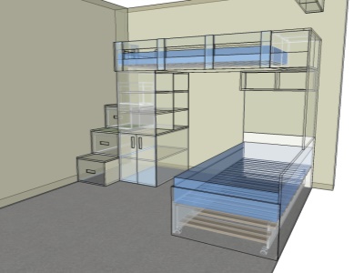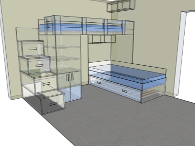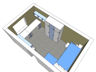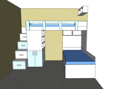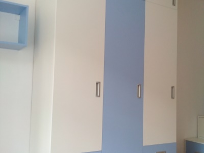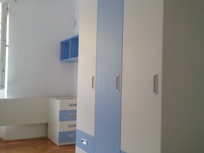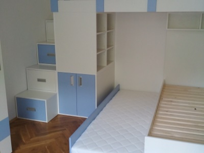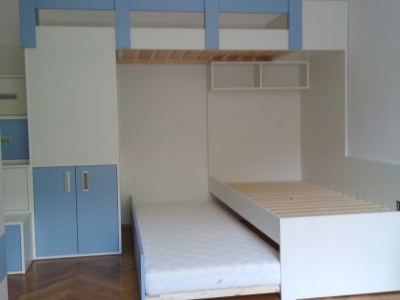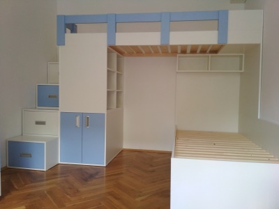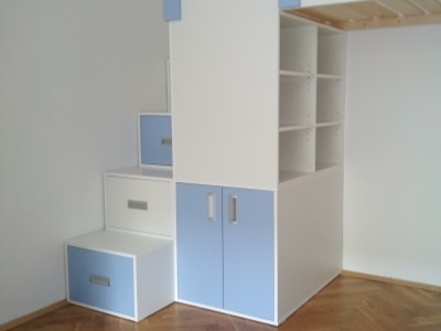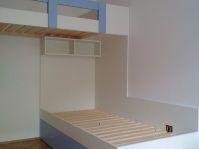 Pokud můžeme vybavit kompletně celý pokoj naším nábytkem, je to pro nás vždy příjemná výzva. Přesně tak tomu bylo v případě tohoto dětského pokoje, jehož součástí byla palanda do "L", včetně výsuvné přistýlky pod spodní postelí, velká skříň, psací stůl se šuplíky a několik dalších polic a skříněk.