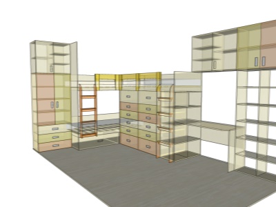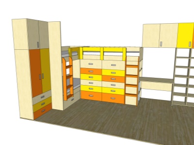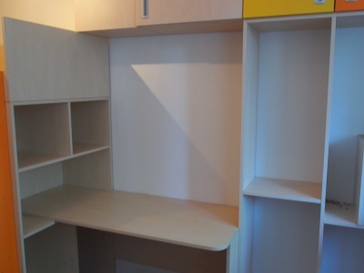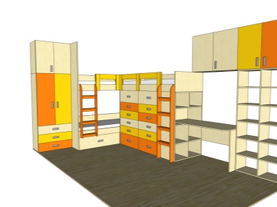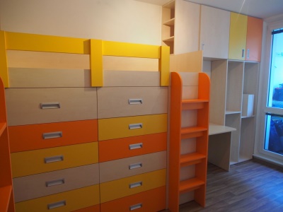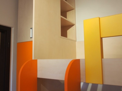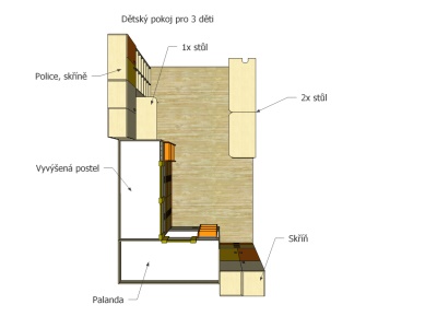 Při vytváření návrhů do tohoto pokoje bylo záměrem, aby každé ze tří děti mělo svoji postel a svůj pracovní stůl a dále mnoho úložných prostor. Úložné prostory jsou velmi rozmanité - od šuplíků, přes klasické skříňky až po otevřené police.