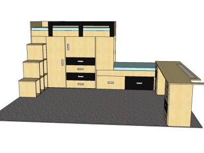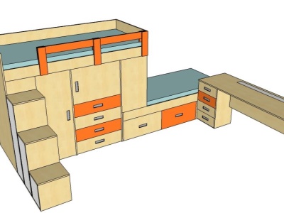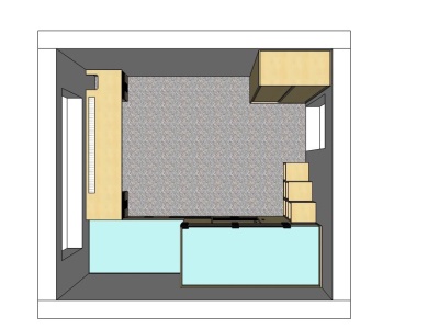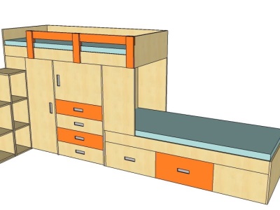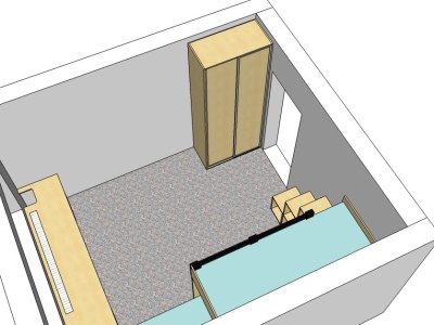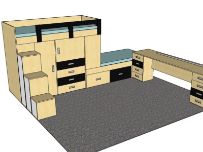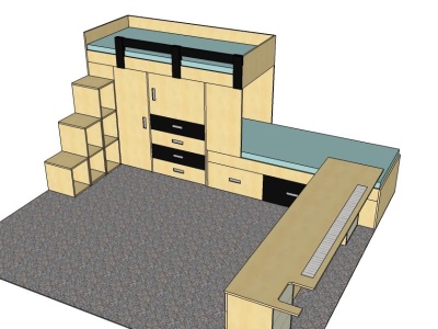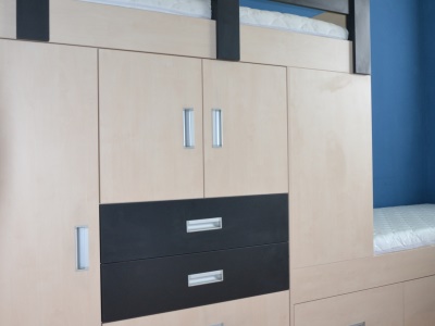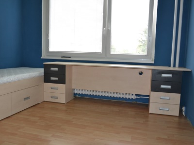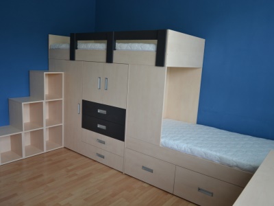 Postele se překrývaly o 45 cm. Ideální řešení pro pokoj, ve kterém se nevejdou 2 postele za sebou. Prostor pod postelemi skýtá mnoho úložných prostor. Další úložné prostory poskytují schůdky k horní posteli. Součástí zakázky byl také psací stůl na míru s výřezem v místě, kde vedly stoupačky, a s větrací mřížkou nad topením. Proti posteli u dveří stála dvoudvéřová skříň s posuvnými dveřmi s policemi.