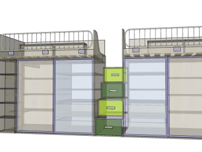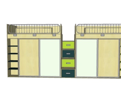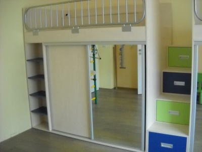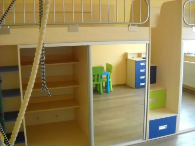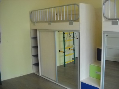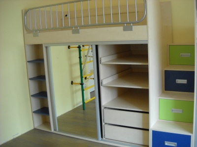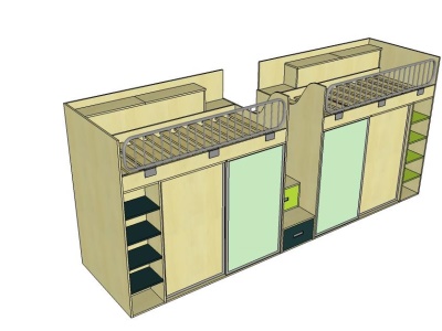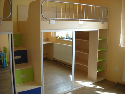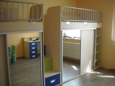 Pokud dispozice pokoje umožní toto uspořádání postelí, určitě bude mít každé dítě k dispozici stejný prostor. Světlost každé postele byla 140 cm. Pod postelemi, které byly opatřeny vzdušným kovovým zábradlím, je umístěna malá šatna, police a šuplíky. V každé z postelí byla matrace 190 x 90 cm, za kterou byl ještě malý úložný prostor v podobě peřiňáku. Celkově byla tedy postel hluboká 114 cm, což skýtalo poměrně velký úložný prostor.